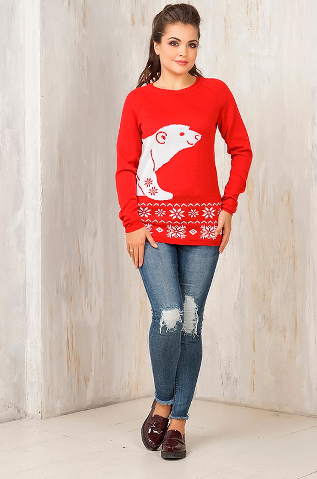 Уютный и теплый джемпер с мишкой и снежинками — он идеален для холодной погоды! Джемпер невероятно мягкий, приятный к телу Силуэт прямой. На горловине, манжетах и подоле вывязана резинка Рисунок с медведем продолжается на спине