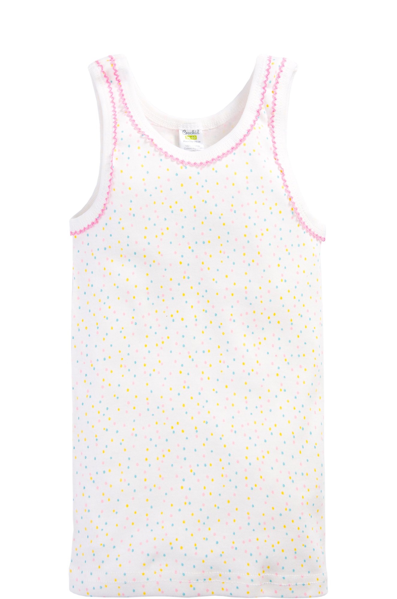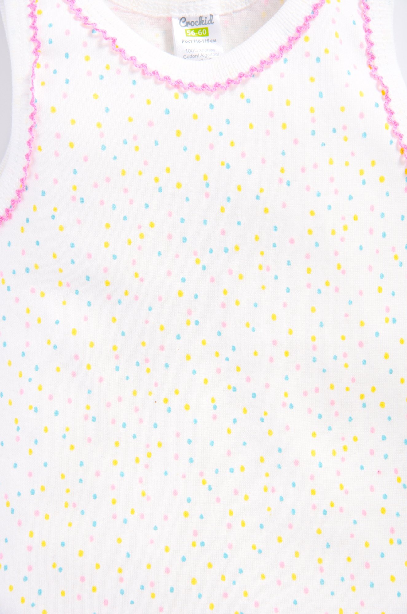 Бесшовная маечка для девочки. Ткань однотонный ластик. Горловина и проймы обработаны бейкой с мережкой.