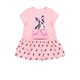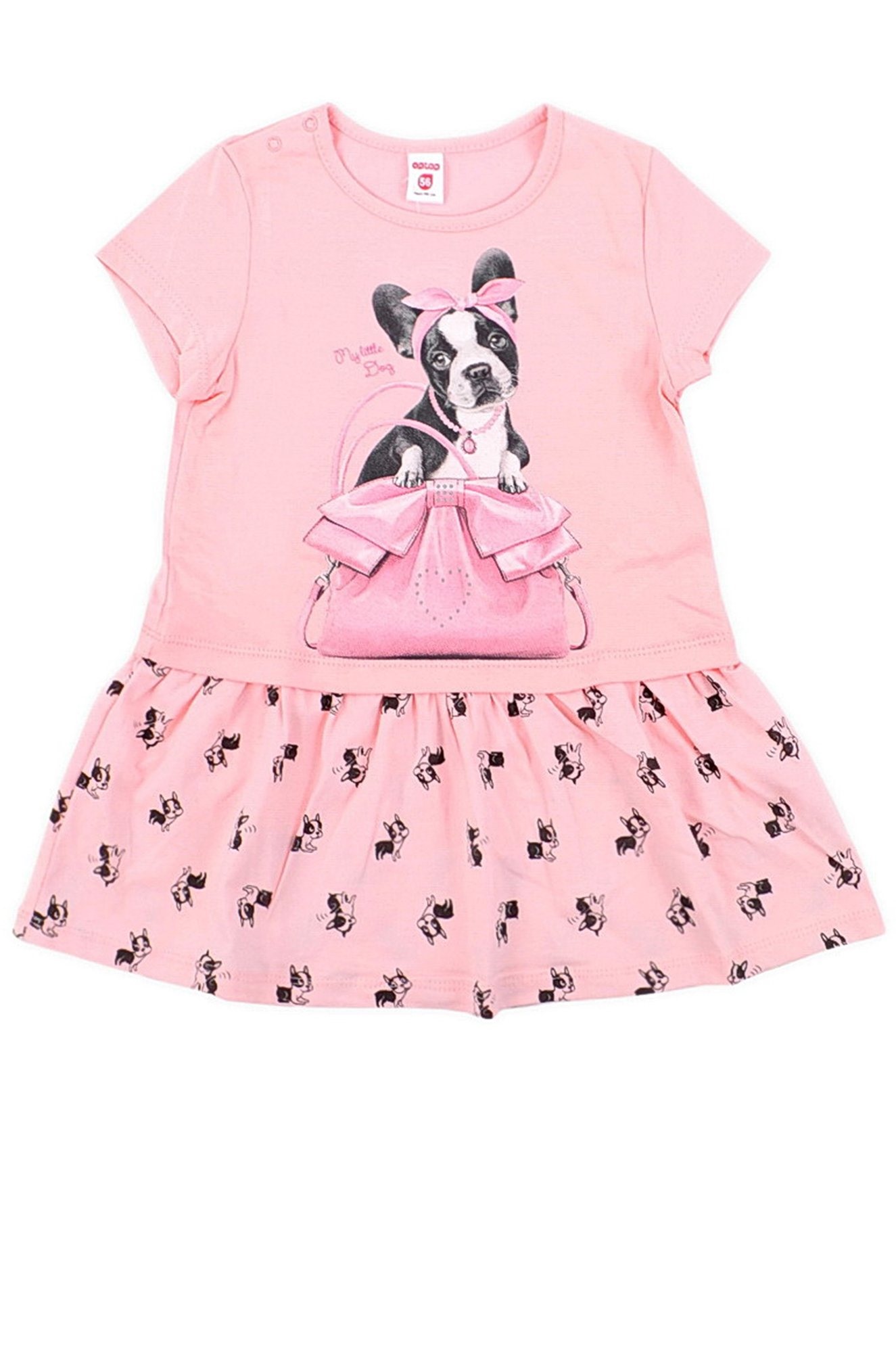 Платье для девочки из супрема. Верхняя часть платья однотонная, нижняя часть отрезная со сборкой из супрема с набивкой. Короткие втачные рукава, по горловине кант, печать на полочке.